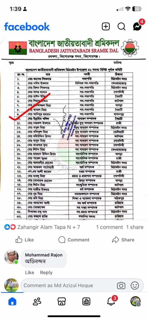 “সংগ্রামী অভিনন্দন! শেখ পরিবারের বিশ্বস্ত হাতিয়ার, দীর্ঘদিনের আওয়ামী রাজনীতির পরীক্ষিত নেতৃত্ব, নবগঠিত মিঠামইন উপজেলা শ্রমিক দলের সাধারণ সম্পাদক জনাব মোঃ ইব্রাহিম খলিল—জাতীয়তাবাদী দলের এই দুঃসময়ে দলকে শক্তিশালী করার জন্য আপনাদের মতো আওয়ামী টাকা ওয়ালা লোকদের খুব প্রয়োজন। তাহলে অতিশীঘ্রই দল অনেক বড় এবং শক্তিশালী হয়ে যাবে বলে আশা করছি।😭”